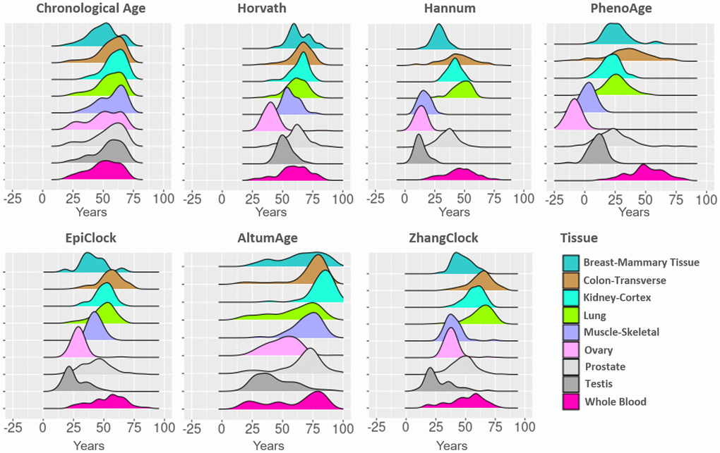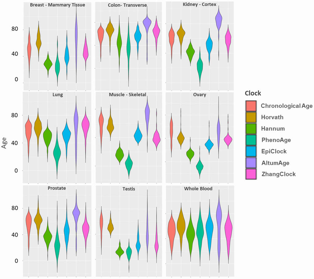 To assess differences across tissues with respect to biological age predictions, we used DNAm data from the Genotype-Tissue Expression (GTEx) Project to obtain epigenetic age estimates for DNAm clocks (Horvath, Hannum, PhenoAge, EpiTOC, EpiClock, AltumAge, Zhang, and Dunedin PACE) across 9 different tissue types (lung, colon, prostate, ovary, breast, kidney, testis, skeletal muscle, and whole blood). We characterize DNAm aging estimates across tissues in terms of the (1) distribution of DNAm clock estimates, (2) strength of each clock’s association with age, (3) correlation of clock estimates between tissue types, and (4) associations of participant characteristics with clock estimates.