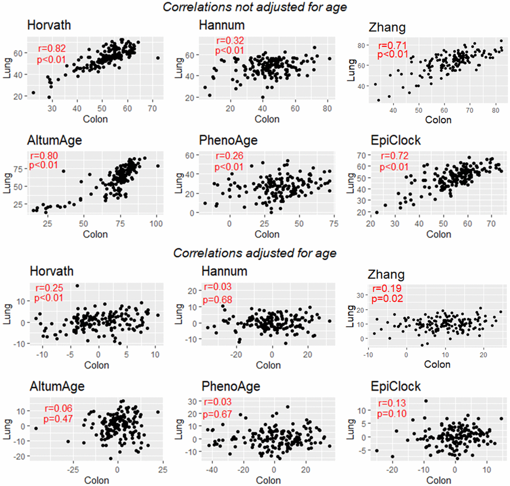As expected, after adjusting for age, the inter-tissue correlations for each clock were substantially attenuated. Examining age-adjusted associations across all possible pairs of tissue types (Supplementary Tables 3–10 and Supplementary Figures 1–6), we find evidence of weak residual correlation in clock estimates between tissues after age adjustment (Figure 3B). The means of the distributions of age-adjusted correlations for all possible tissue pairs correlations were greater than zero for each clock examined (EpiTOC P=0.003, Hannum P=0.02, Horvath P=0.0003, PhenoAge P=0.01, EpiClock P=0.02, AltumAge P <0.001, Zhang P=0.02). Figure 4 (bottom) shows the correlation between the age-adjusted clock estimates for lung and colon, with only the Horvath clock showing a correlation with P<0.05.