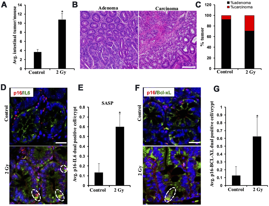 Figure 1. Low-LET radiation-induced tumor development in Apc1638N/+ mice is accompanied by an increased number of intestinal cells displaying senescence and SASP. (A) Intestinal-tumorigenesis at 150 days post-exposure (n=10 per group). Data presented as mean ± SEM, and * p<0.05, relative to control animals. (B) Representative H&E-stained micrographs of intestinal adenoma and carcinoma. (C) Quantification of adenoma and carcinoma as a percentage of total tumors. (D) Representative immunofluorescence micrographs of intestinal epithelium showing p16 (red) and IL6 (green) dual positive SASP cells. (E) Quantification of p16 and IL6 dual positive cells. Data presented as mean ± SEM, and * p<0.05, relative to control animals. (F). Representative immunofluorescence micrographs of intestinal epithelium showing p16 (red) and BCL-XL (green) dual positive senescent cells. (G). Quantification of p16 and BCL-XL dual positive cells. Data presented as mean ± SEM, and * p<0.05, relative to control animals.
