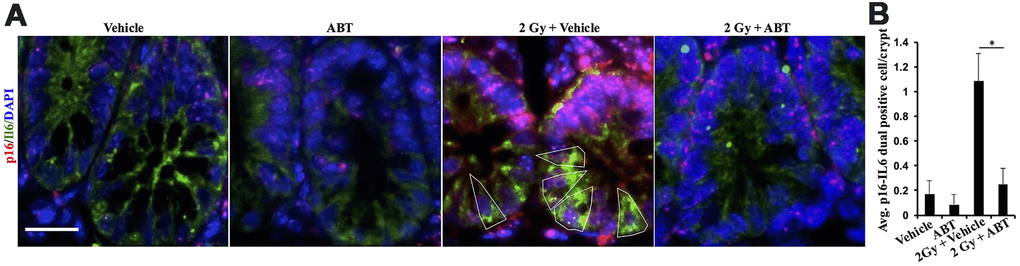 Figure 3. ABT-263 eliminates SASP cells from the intestinal epithelium of γ-exposed Apc1638N/+ mice. (A) Representative immunofluorescence micrographs of the intestinal epithelium showing p16 (red) and IL6 (green) dual-positive cells. (B) Quantification of p16 and IL6 dual-positive cells. Data presented as mean ± SEM, and * p<0.05, relative to control animals.