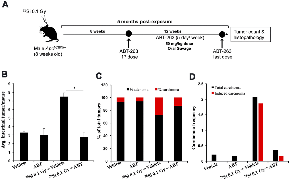 Figure 4. ABT-263 mitigates high-LET 28Si-induced intestinal tumor development in male Apc1638N/+ mice. (A) Experimental plan of ABT-263 testing as a mitigator for 28Si -induced intestinal carcinogenesis. (B) Intestinal-tumorigenesis at 150 days post-exposure in vehicle only (n=10), ABT-263 only (n=5), 0.1 Gy 28Si + vehicle (n=10), and 0.1 Gy 28Si + ABT-263 (n=10) groups. Data presented as mean ± SEM, and * p<0.05, relative to control animals. (C) Quantification of adenoma and carcinoma percentage. For each group, the percentages of adenomas and carcinomas relative to the total number of tumors assessed were calculated. (D) Effect of ABT-263 on spontaneous and IR-induced carcinoma frequency. Carcinoma frequency was defined as the number of carcinomas divided by the total tumors assessed. The induced carcinoma frequency was obtained by subtracting the spontaneous carcinoma frequency (from the control group) from that of the irradiated groups.
