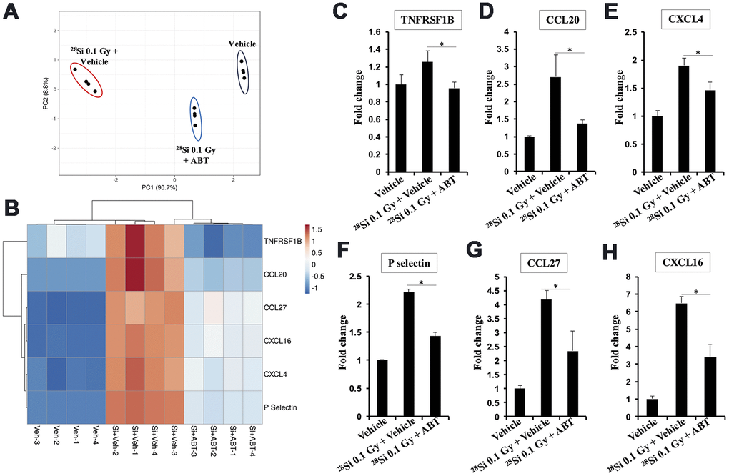 Figure 5. Effect of ABT-263 on SASP factor expression in the 28Si-exposed Apc1638N/+ mice serum. (A) Principal component analysis (PCA) plot for cytokines showing differential expression. (B) Heat map showing differential expression of SASP factor expression in serum obtained from vehicle, 28Si + vehicle, and 28Si + ABT-263 groups. (C) Fold change in serum TNFRSF1B. (D) Fold change in serum CCL20. (E) Fold change in serum CXCL4. (F) Fold change in serum P-selectin. (G) Fold change in serum CCL27. (H) Fold change in serum CXCL16. Quantitative data presented as mean ± SEM, and * depict a statistically significant difference (p<0.05) between the indicated groups.