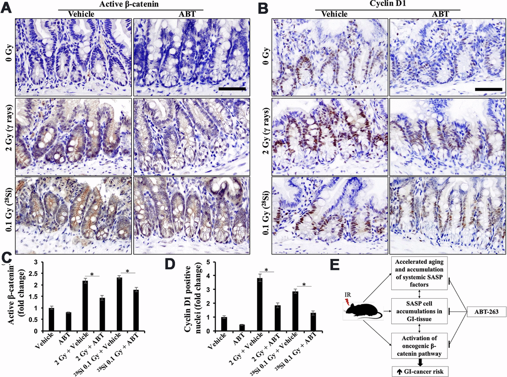 Figure 6. ABT-263 dampens low- and high-LET radiation-induced oncogenic β-catenin signaling. (A) Representative micrographs of active-β-catenin immunostained intestinal tissue sections. (B) Representative micrographs of cyclinD1 immunostained intestinal tissue sections. (C) Quantification of active-β-catenin-stained images. Quantitative data presented as mean ± SEM, and * depicts a statistically significant difference (p<0.05) between the indicated groups. (D) Quantification of cyclin D1-stained images. Quantitative data presented as mean ± SEM and * depicts a statistically significant difference (p<0.05) between the indicated groups. (E) Schematic summary of mechanisms of ABT-263-mediated prevention of IR-induced GI tumorigenesis in Apc1638N/+ mice.