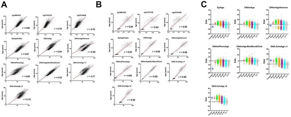 The comparative analysis of EpiAgePublic and other clocks demonstrated EpiAge’s strong predictive relationship with chronological age, achieving a correlation coefficient of 0.93. DNAmAgeSkinBloodClock exhibited the highest correlation at 0.99 (Figure 1B). These findings validate the utility of EpiAgePublic for non-invasive biological age estimation across different tissues, including saliva, which has obvious advantages as far as accessibility and compliance over blood.
