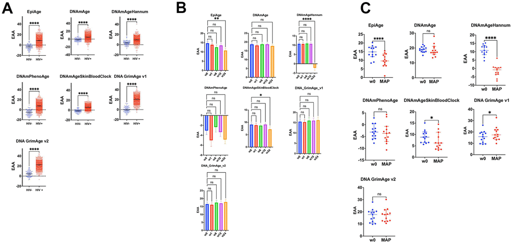 Building on these findings, we explored the dynamics of epigenetic aging among HIV-positive individuals to assess how a specific treatment strategy influenced these patterns.