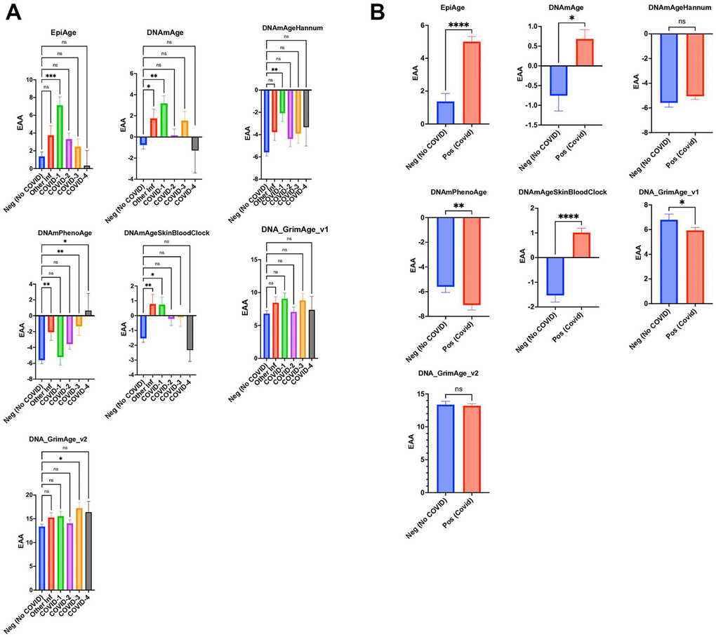 GrimAge v1 did not show significant differences across groups. GrimAge v2 revealed that COVID-3 severity had a significant age acceleration (3.892 years, P=0.0402) compared to negative control, indicating nuanced responses across different epigenetic clocks to COVID-19 severity and other infections (Figure 3A).