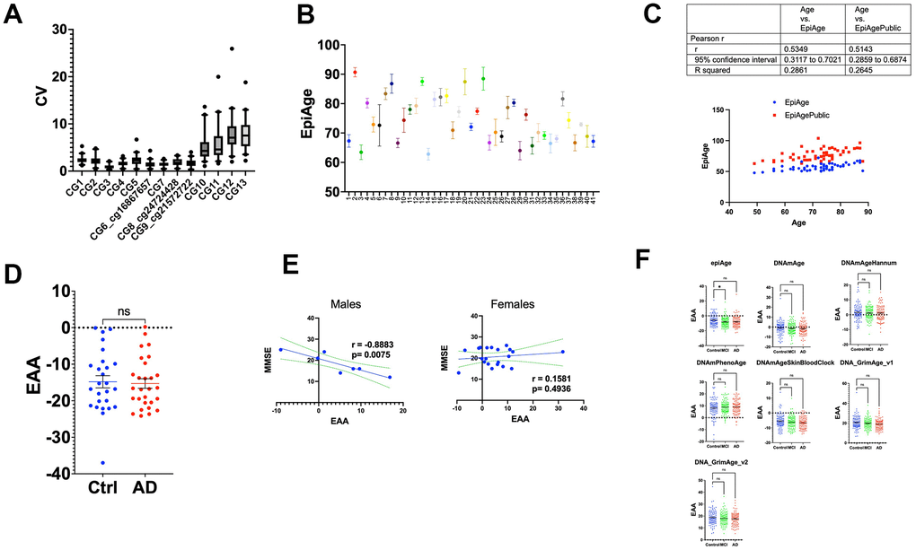 To examine EAA in AD patients in other studies, we analyzed the Epic Array dataset GSE144858 (Roubroeks et al., 2020), derived from the EU-funded AddNeuroMed Cohort, a large cross-European AD biomarker study using human blood DNA (Fransquet et al., 2021; Levine et al., 2015). This dataset included 96 control individuals, 111 with mild cognitive impairment (MCI), and 93 with Alzheimer’s Disease (AD).