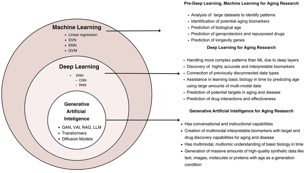 AI encompasses various subfields, including Machine Learning (ML) and DL. Figure 1 illustrates the hierarchical relationship between the different types of AI and their functionality and capabilities. ML refers to algorithms and statistical models that enable computers to perform tasks without explicit instructions, relying on patterns and inference [3]. DL, a subset of ML, uses neural networks with many layers (hence “deep”) to analyze various types of data [4]. DL was first applied to aging research in 2015-2016 with the publication of deep aging clocks (DACs) by A. Zhavoronkov’s group [5]. Since then, many techniques in DL, such as Generative Adversarial Networks (GAN), Large Language Models (LLM), and Denoising Diffusion Probabilistic Models, have been applied to advance aging research, and for comprehensive health assessment in healthy longevity medicine (Figure 1). The results of these first applications were presented in workshops and conference presentations before they were published, such as using DL to automate multispecies phenotyping in aging research [6], DL for drug clustering and automatic cell staining as well as for generating synthetic data with age as generation condition [7] or screening the small molecule library for DNA-repairing compounds [8].