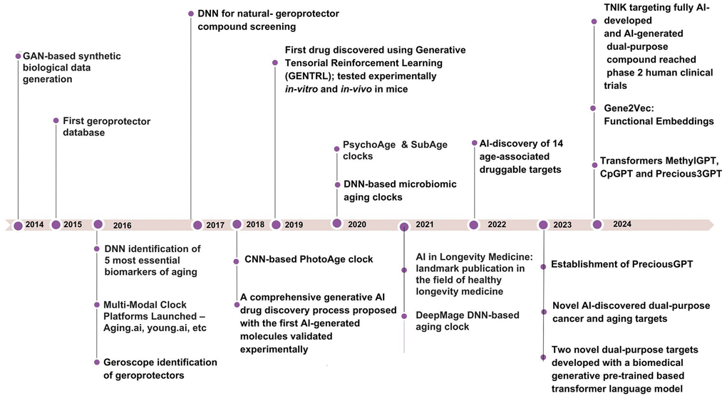 Built using transformer architecture, LLMs have emerged as a significant part of natural language processing [46], LLMs use vast sets of textual data to learn linguistic patterns, syntax, and semantics enabling them to perform a wide range of language-based tasks. Retrieval Augmented Generation improves LLMs by combining traditional generative capabilities with a two-component retrieval mechanism system, fetching and integrating relevant documents [47]. It allows LLMs to access and incorporate external information in real-time, significantly improving response accuracy and contextual relevance, making natural language processing more reliable. In aging research, LLMs have shown potential for analyzing and summarizing vast amounts of scientific literature, potentially accelerating the discovery of aging-related insights and drug targets [48, 49]. Figure 3 demonstrates the timeline of DL and GenAI application to aging research.