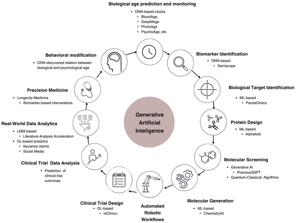 GenAI algorithms significantly expand the capabilities of ML by producing diverse outputs, including text, images, and simulations. These algorithms leverage large-scale datasets to generate results tailored to specific parameters and requirements [22]. While many GenAI systems employ advanced neural network architectures, the field encompasses a variety of techniques for creating new data based on learned patterns and distributions. A prominent example of GenAI is the Generative Adversarial Networks (GANs), introduced by Goodfellow et al. in 2014 [23, 24]. GANs have demonstrated effectiveness in various medical applications, including medical image analysis [25–28] and disease progression modeling [29, 30]. In the context of aging research, GenAI techniques like GANs have shown promise in several areas. They have facilitated the development of biomarkers and early geroprotective interventions [31, 32], advanced understanding of age-related changes, and improved dataset balance for training more accurate predictive models. For instance, Campello et al. (2022) used GANs to synthesize aged and rejuvenated cardiac images from cross-sectional data, modeling realistic age-related changes in the heart [33]. Additionally, GenAI has been applied to protein function prediction [34] and the generation of synthetic biological data for hypothesis testing and model validation [35]. Figure 2 (adapted from Zhavoronkov et al., 2021, [36]), overviews the use of GenAI in various areas of aging research.