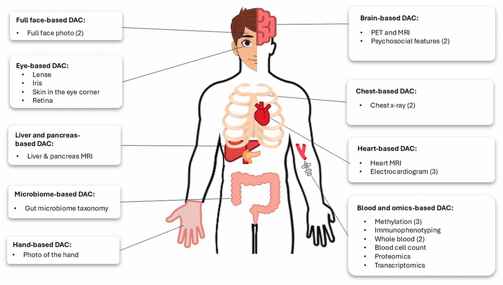 Table 1 compiles the list of deep aging clocks (DACs), specifying their mean absolute error (MAE) in years and type of training data. Figure 4 represents a schematic overview of DACs identified in this review, categorized by the biological or anatomical regions they assess.