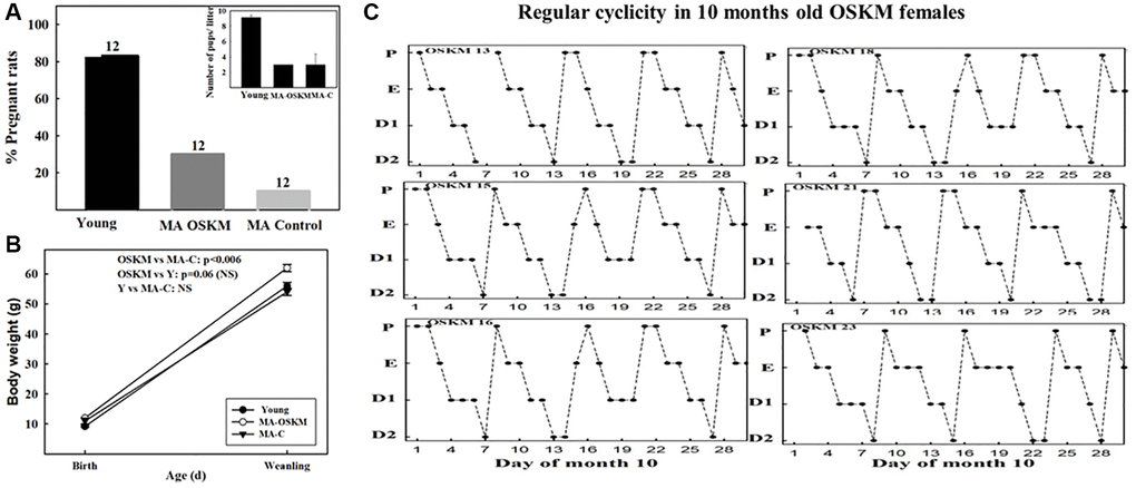 When the GFP and OSKM rats reached the age of 9 months and 10 days (40 weeks), a group of 12 intact female rats (3–4 months) was added (Y group). In each experimental group the 12 animals were divided into 4-rat subgroups, each of which was mated for one week with a young male rat (3–4 months). At the end of the pregnancy period pregnant rats were placed in single cages the number of pups per litter was counted and the newborn rats were weighed. At weaning, pups were weighed again in order to compare their BW gain.