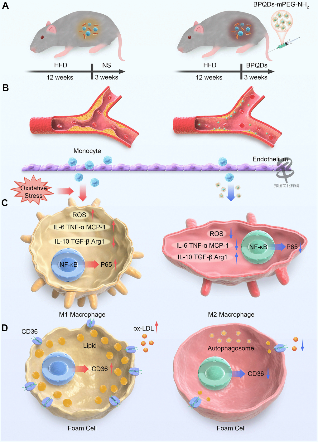 The results of the in vivo and in vitro experiments indicated that BPQDs cleared the aortic plaque area and restored partial vascular elasticity, thereby alleviating atherosclerosis. BPQDs may also promote autophagy of foam cells in the aortic wall. BPQDs also reduced liver fat accumulation, blood lipid levels, and serum inflammatory cytokines.