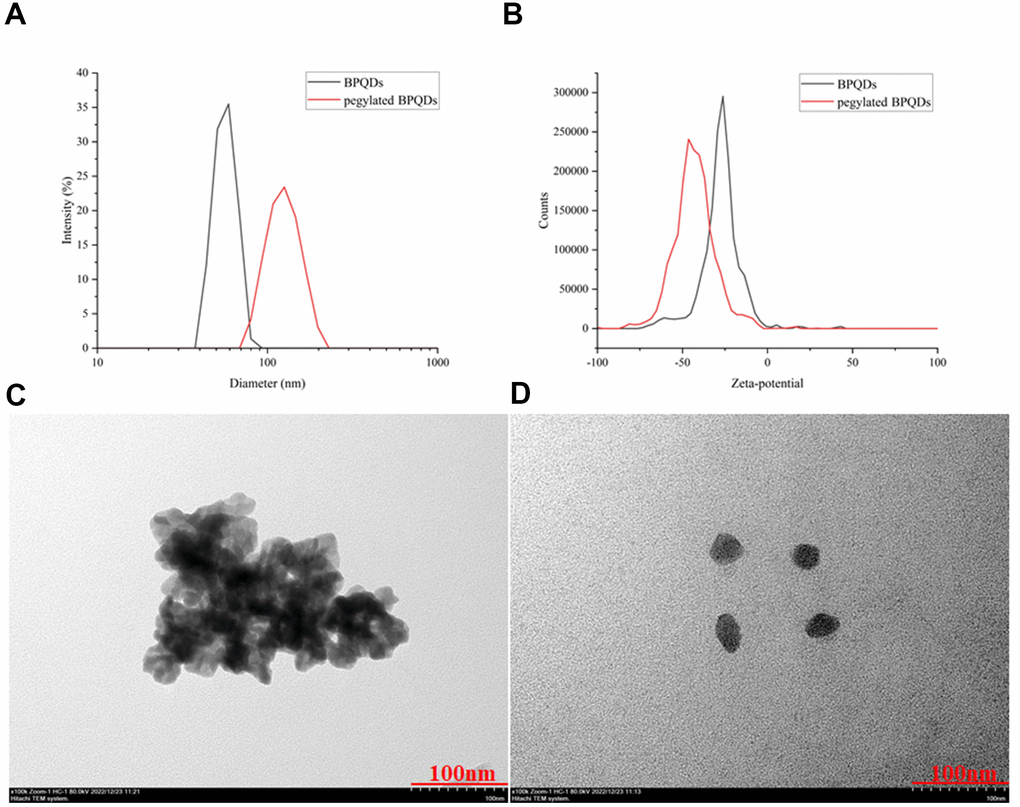 The particle size, zeta-potential, and morphology before and after modification of BPQDs by PEG were determined by transmission electron microscope (TEM) and are shown in Figure 2. The particle size of BPQDs increased after PEG-based modification, from a mean of 60 nm to 105 nm, demonstrating successful modification of BPQDs by PEG (Figure 2A). After PEG-based modification, the zeta potential value of BPQDs decreased from a mean of −25 to −50, demonstrating that the stability of BPQDs in solution improved after modification (Figure 2B). Moreover, the form of BPQDs was aggregated into a group before modification, while the form after modification was a single sheet, indicating that BPQDs modified by PEG were more easily dispersed and their chemical properties were more stable (Figure 2C, Figure 2D).