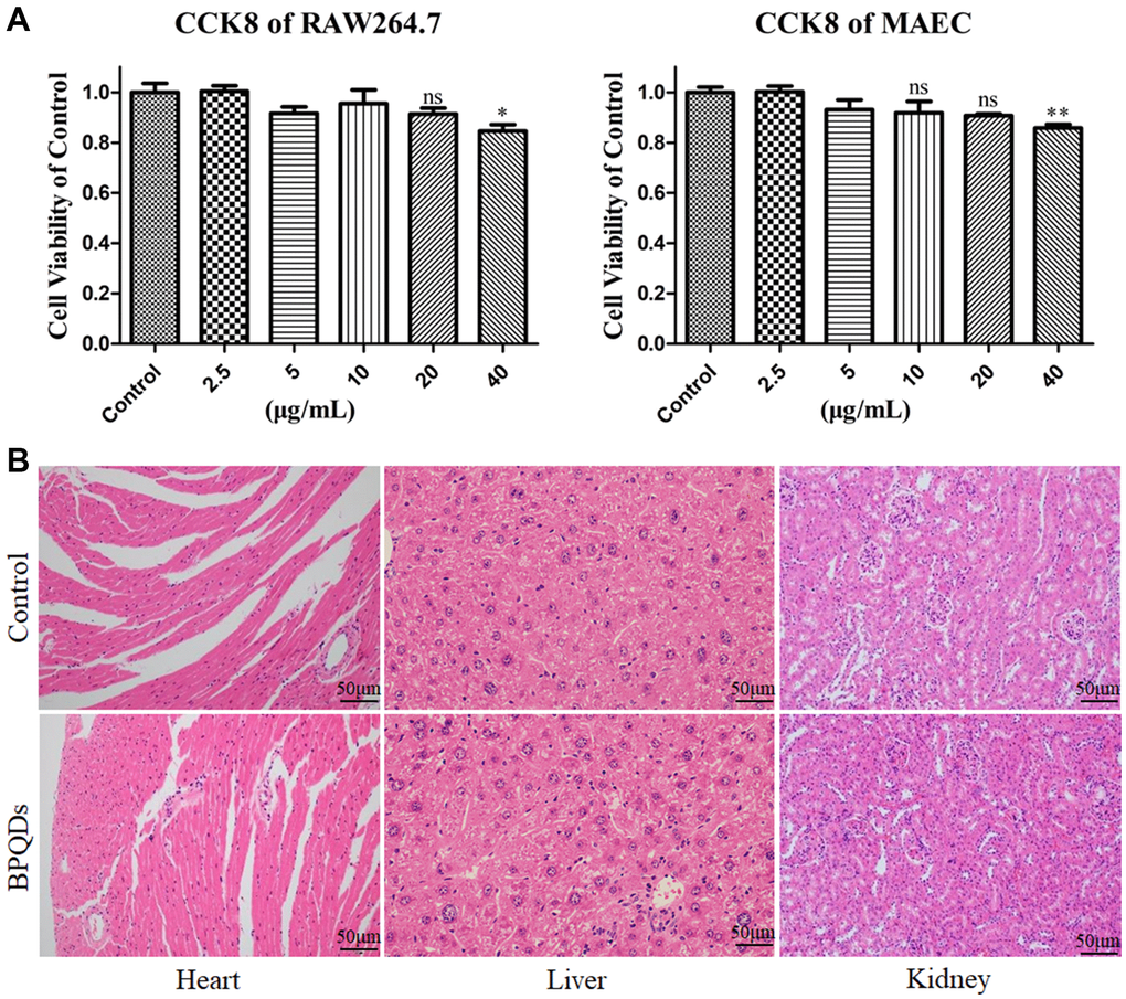 The results of CCK-8 assay showed that the low concentration of BPQDs had no obvious toxic effect on macrophages and endothelial cells, while 20 μg/mL was the optimal concentration, which was used in the following cell experiments (Figure 3A). Pathological sections of mice showed no significant difference in the tissue structure of heart, liver, and kidney between the control and BPQD groups (Figure 3B). Serum detection showed no significant difference in the serum oxidation factor levels between the control and BPQD groups as well as body weight of mice (Supplementary Figure 2). The results indicated that BPQDs showed no obvious toxicity to the heart, liver, and kidney, and did not cause an obvious oxidative stress response in mice. The results of cytotoxicity and animal experiments suggest that BPQDs were safe in vivo and in vitro.