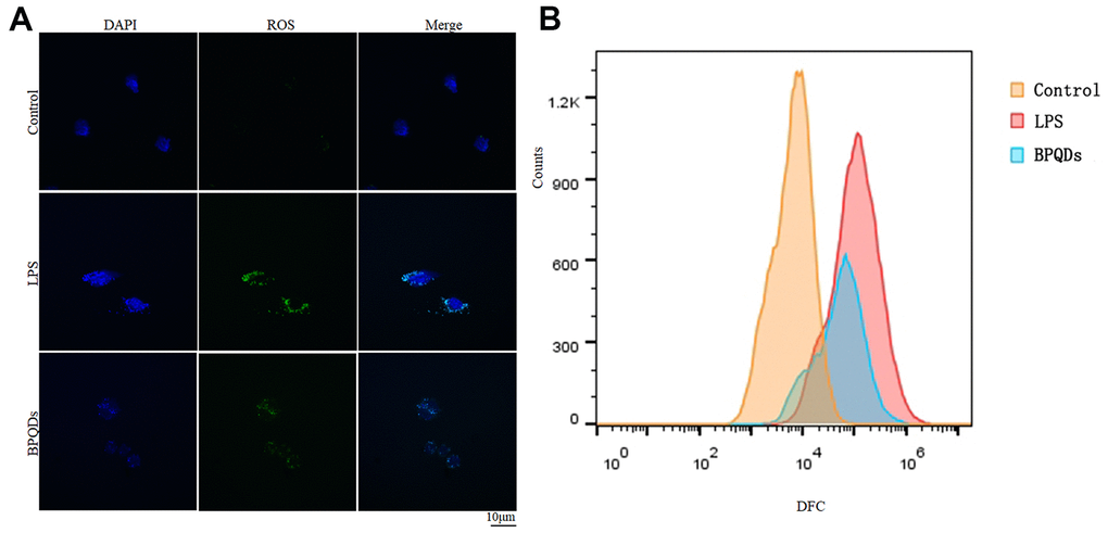 RAW264.7 macrophages were induced into an inflammatory state by lipopolysaccharide (LPS), before treating with BPQDs and measuring the ROS expression in each group (control, model, BPQDs) by laser scanning confocal microscopy and flow cytometry.