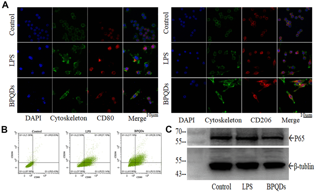 Western blot showed that the expression level of P65 in the BPQD group was lower than that in the LPS group (Figure 5C and Supplementary Figure 4C). Real-time quantitative PCR showed that the gene expression levels of pro-inflammatory cytokines and chemokines in macrophages in the LPS group increased, while those in the BPQD group decreased. Furthermore, the gene expression levels of inhibitory cytokines increased in the BPQD group, but not in the LPS and control groups (Supplementary Figure 5A, 5B). The results indicated that BPQDs reduced the expression of regulatory factor P65 and had a regulatory effect on NF-κB signaling pathway, inhibiting M1 macrophages polarization but promoting M2 polarization. Moreover, BPQDs reduced the gene expression of M1-polarized pro-inflammatory cytokines and chemokines in macrophages while increasing the gene expression of M2-polarized inhibitory cytokines in macrophages, thereby playing a role in regulating inflammation.