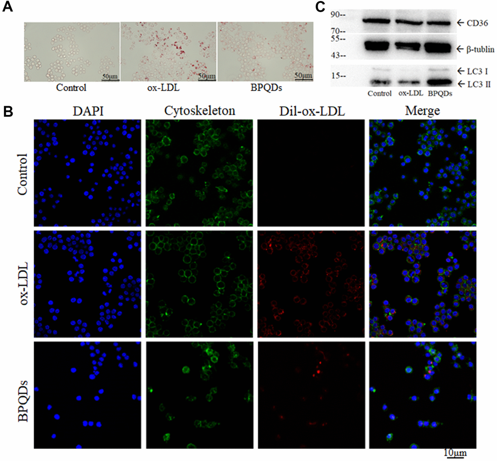 RAW264.7 macrophages were induced to foam cells by ox-LDL before treatment with BPQDs, staining with oil red O staining in each group (control, ox-LDL, BPQDs), and detection using an optical microscope. Phagocytosis of macrophages on ox-LDL labeled by fluorescein was detected by fluorescence microscopy. The cells of each group were collected to extract protein and RNA. The protein was used for western blot to detect the expression of the cell surface scavenger receptor CD36 and the autophagy marker protein LC3-II/I, while the RNA was used for real-time quantitative PCR to detect the gene expression of CD36 and other lipid metabolic factors.