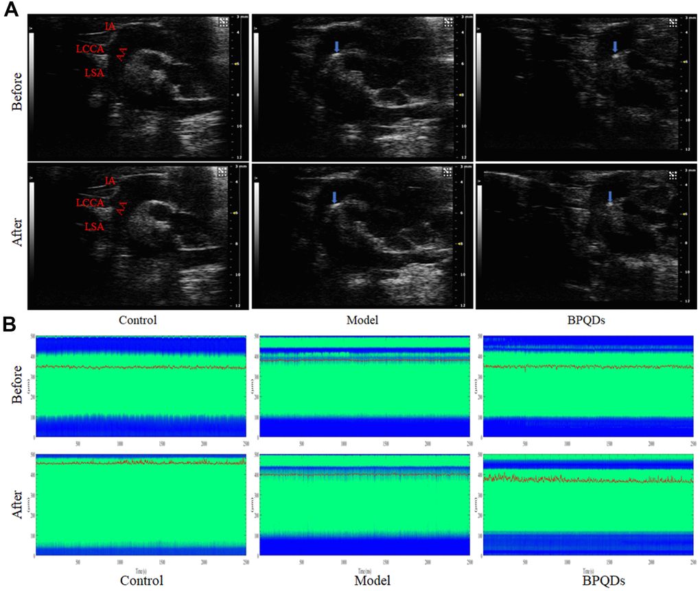 Ultrasonography showed that atherosclerotic plaques appeared in the aortic arch of Apoe−/− mice fed a high-fat diet for 12 weeks (including the model group and BPQD group), demonstrating successful establishment of the atherosclerotic mouse model. After 3 weeks of treatment, the plaques in the aortic arch of the model group continued to grow, while that in the BPQD group decreased (Figure 7A). The innominate artery elasticity of the BPQD group was higher than that of the model group, and the peak systolic velocity (PSV) of the innominate artery in the BPQD group was higher than that in the model group (Supplementary Figure 8A, 8B).