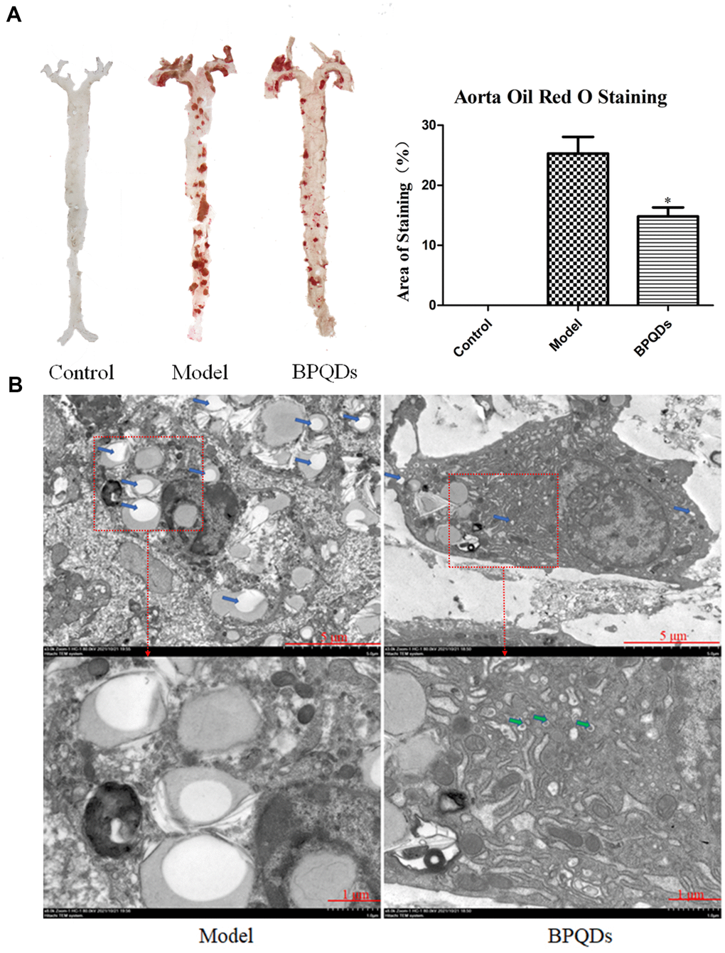Aorta oil red O staining showed a large area of plaques in the aortic tree of mice in the model group, while the plaque area in the BPQD group was significantly reduced by 45.3% compared to the model group. The effect was better than that of traditional statins (15.3% less than the model group). (Figure 8A). TEM images of the aorta showed numerous lipid droplets in the aortic wall in the model group, while lipid droplets reduced and autophagosomes appeared in the BPQD group (Figure 8C).