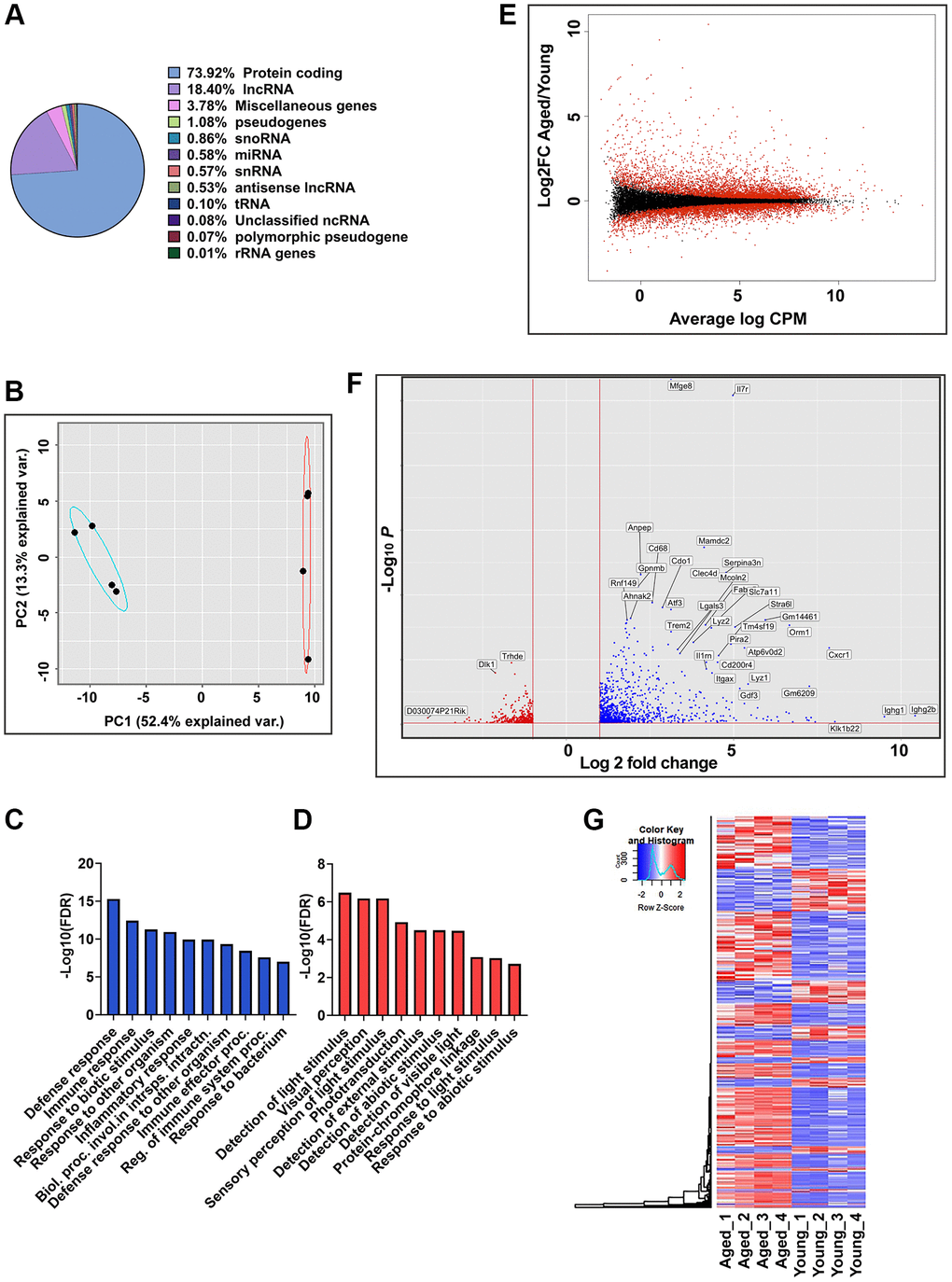 RNA-seq data were generated from RPE/choroid tissues of both young (2–3 months) and aged (20–24 months) C57BL/6J mice (n = 4, two males and two females per group). This comprehensive approach aimed to capture the entire transcriptome profile and provide insights into age-related changes in gene expression in RPE/choroid. The sequencing depth averaged 50.2 million reads per library, with 21,376 transcripts mapped to the mouse reference genome (GRCm39). Of the 21,376 transcripts mapped, 73.92% were protein-coding, and 18.4% were assigned to long non-coding transcript types, making them the predominant transcript types (Figure 1A). The remaining ~3.8% represent other transcript types such as snoRNAs, miRNAs, snRNAs, unclassified ncRNAs, antisense lncRNAs, tRNA, rRNA, pseudogenes, and polymorphic pseudogenes (Figure 1A). Principal component analysis (PCA) was performed using the normalized read counts to obtain a global characterization of the mouse transcriptome. PCA revealed distinct clustering of young and aged groups along PC1, accounting for 52.4% of the variance, suggesting age as the primary driving factor (Figure 1B). To elucidate the biological processes underlying this segregation, Gene Ontology (GO) analysis was performed on the top 100 loading genes of PC1. Genes with positive loadings in PC1 exhibited enrichment in GO terms related to defense response, immune response, and inflammatory response pathways (Figure 1C), while genes with negative loadings in PC1 were enriched for GO terms associated with visual perception and phototransduction (Figure 1D and Supplementary Table 1).