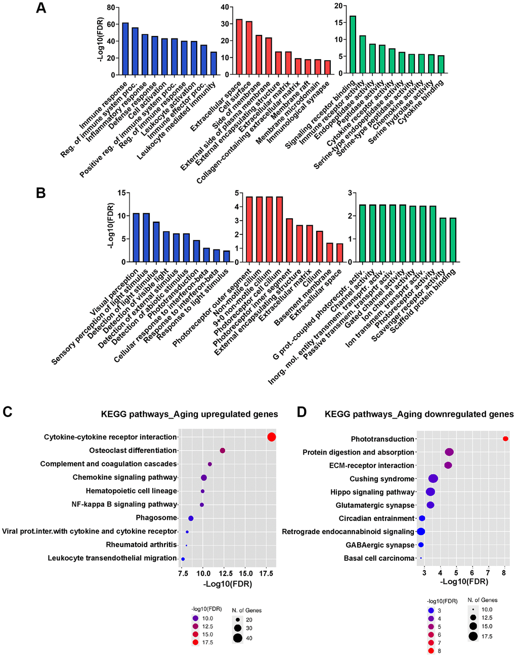 To further elucidate the characteristics of the DEGs, we performed a GO analysis using the top 100 significantly upregulated and downregulated genes. The functional GO terms were classified into three categories: biological process (BP), cellular component (CC), and molecular function (MF), as shown in Figure 2A, 2B. For genes upregulated in aged RPE, GO analysis revealed a notable enrichment in biological processes associated with immune response, regulation of immune system processes, inflammatory response, defense response, cell activation, positive regulation of immune system processes, regulation of immune response, leukocyte activation, immune effector processes, and leukocyte-mediated immunity. Additionally, molecular function and cellular component GO terms displayed enrichment in signaling, receptor activity, extracellular space, and cell surface, indicative of active proinflammatory milieu in the aging RPE (Figure 2A and Supplementary Table 2). GO annotation of downregulated genes included processes related to visual perception, sensory perception of light stimulus, detection of light stimulus, detection of visible light, detection of external stimulus, detection of abiotic stimulus, phototransduction, cellular response to interferon-beta, response to interferon-beta, and response to light stimulus (Figure 2B). This decline in the expression of genes associated with visual pathways and phototransduction is consistent with the potential degeneration of RPE and impaired vision associated with aging. Photoreceptor outer segment and G-protein coupled photoreceptor activity were the most significantly enriched GO terms in the cellular component and molecular function categories, respectively (Figure 2B and Supplementary Table 2). These findings suggest that genes implicated in crucial RPE functions, such as maintaining visual processing in the retina including absorption of light passing through the neurosensory retina, phagocytosis of photoreceptor outer segments, and sustaining the retinoid cycle or visual cycle are impacted by aging.