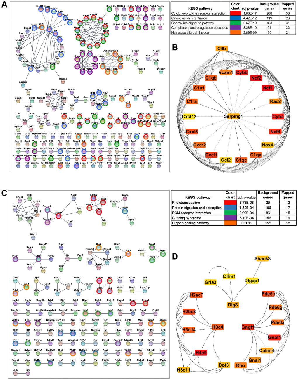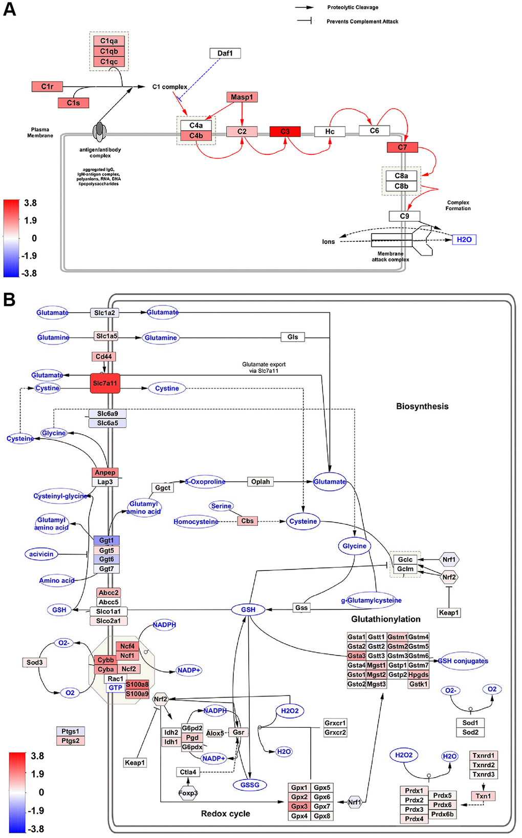 We utilized the WikiPathways app within the Cytoscape network analysis and visualization software to conduct pathway mapping of hub genes. Wikipathways, a curated collection of mouse pathways, was used to identify the biological pathways most affected in RPE with age [25]. The top most significant Wikipathways to which hub genes were mapped included the complement activation classical pathway (WP200, adj p-val = 8.3E-10), oxidative stress and redox pathway (WP4466, adj p-val = 8.5E-08), and chemokine signaling pathway (WP2292, adj p-val = 8.3E-10) (Figure 5A, 5B and Supplementary Figure 1). Moreover, several genes associated with these pivotal pathways were also significantly altered in our transcriptome dataset. The majority of these genes exhibited positive regulation, indicating the crucial involvement of oxidative stress, complement, and the chemokine system in RPE aging (Figure 5A, 5B and Supplementary Figure 1).