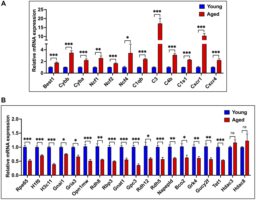 We validated our RNA-seq data findings through qPCR analysis using a new cohort of animals. We selected 31 genes: 12 age-upregulated, 17 age-downregulated, and two genes that showed no significant difference between young and aged RPE. The age-upregulated representative genes of major pathways included Cybb, Cyba, Ncf1, Ncf2, and Ncf4 for the oxidative stress and redox pathway, C1qb, C3, C4b, and C1s1 for the complement pathway, Cxcr1 and Cxcr4 for chemokine response and Best1, an RPE-specific marker (Figure 4A). For transcripts downregulated in aging, we analyzed Rpe65, the classical RPE biomarker; histones H1f0 and H3c11; hub genes Gnai1, Gria3, Gnat1; visual and phototransduction pathway genes Opn1mw, Rdh8, Rbp3, Gpc3, Rdh12, Rdh5, Napepld, Bco2, Grk4, Gucy2f, and the epigenetic regulator Tet1 (Figure 4B). Additionally, we verified the expression of other epigenetic regulators, Hdac3 and Hdac8, which remained unchanged with age (Figure 4B). The results of these expression analyses corroborated the RNA-seq data. In line with the RNA-seq and qPCR results, immunofluorescence (IF) staining of retinal cross sections in mice showed increased expression of C4b and reduced expression of H1f0 in aged mice RPE compared to young cohorts (Supplementary Figure 2).