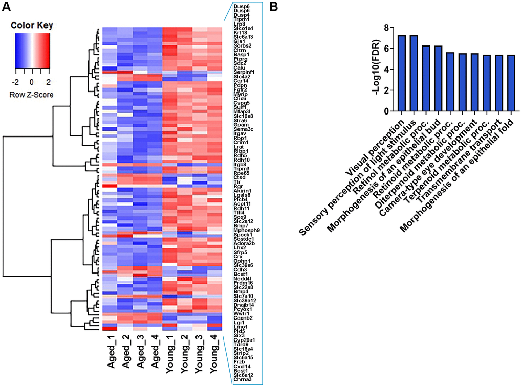 During the physiological aging process, retinal tissues undergo functional decline and degeneration with the RPE serving as the primary site of damage in many age-related retinal diseases [7]. While aging itself may not invariably lead to the onset of conditions such as age-related macular degeneration (AMD), retinitis pigmentosa (RP), and diabetic retinopathy (DR), age-related changes can predispose the eye to these diseases [8]. AMD, a leading cause of vision loss in developed countries, is characterized by progressive degeneration of the RPE, retina, and choriocapillaris [9, 10]. Numerous studies have documented age-related physiological changes in the RPE and the underlying Bruch’s membrane, including the accumulation of intracellular granules containing oxidized lipids known as lipofuscin, mitochondrial DNA damage, lysosomal dysfunction, buildup of metabolic debris, and drusen biogenesis which is a hallmark feature of AMD progression [11–14]. Drusen accumulation impedes diffusion from the choroidal circulation to the retina exerting adverse effects on both RPE and photoreceptors. Drusen has a complex composition that comprises many inflammatory proteins, including complement factors, cytokines, C-reactive protein, IgG, and major histocompatibility class II molecules [15, 16]. Elevated expression and localization of proinflammatory factors associated with drusen biogenesis trigger oxidative stress and cellular dysfunction, which have long been recognized as significant factors influencing the pathophysiology of AMD [12, 17]. Due to the neural retina’s high energy requirements, the RPE remains metabolically active, constantly producing energy to support both the neural retina and the visual cycle. As a result, the RPE is abundant in mitochondria, making it a primary source of reactive oxygen species (ROS), and these mitochondria increase their ROS production during aging [18]. Despite scientific advancements that have established a multitude of molecular pathways significant in the pathogenesis of RPE atrophy and age-related retinal diseases, the genes driving biologic aging remain poorly understood [19, 20]. Deciphering differential gene expression profiles in young and aged RPE is critical to identifying molecular mechanisms that provide fundamental scientific insight into RPE aging and potential therapeutic targets for age-related retinal pathologies.