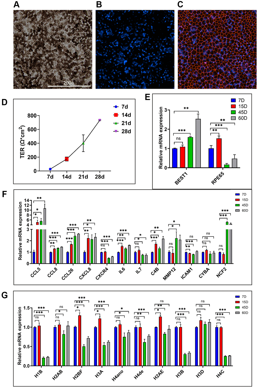 We analyzed histone expression levels in chronologically aged hRPE cells, building upon our recent demonstration of significant histone downregulation in aging mouse and human RPE in vivo [30]. A progressive depletion of various histone isoforms was observed at 15, 45, and 60 days (Figure 7G) compared to 7-day controls. Certain histone isoforms like H1B, H2BF, H3A, H3B, and H4C were substantially depleted with increasing culture time, unlike H2AB and H3D, which remain unchanged. Together, these findings highlight that chronological aging of RPE, both in vivo and in vitro, is marked by the upregulation of inflammation genes and oxidative stress genes. Our model of long-term hRPE cultures recapitulated many validated cellular and molecular signatures of the aging RPE in vivo.