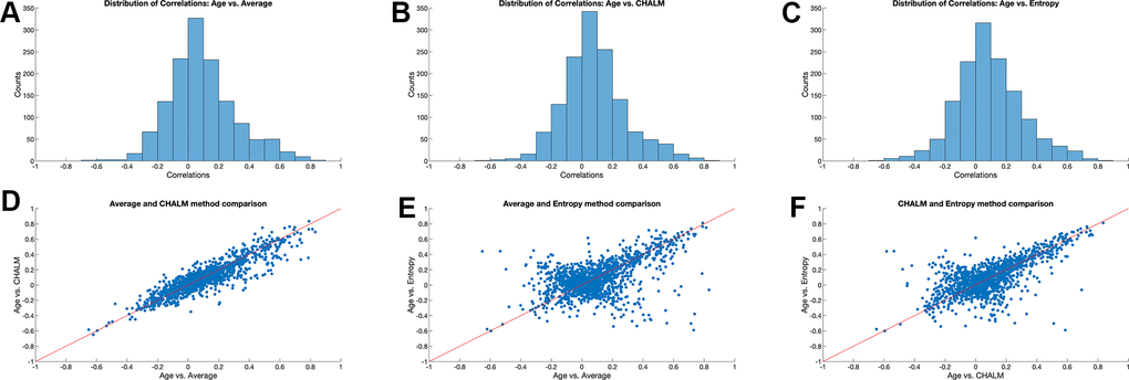 We compared these three metrics in a dataset of 100 individuals of varying ages. The methylation levels were measured across approximately 3000 loci using targeted bisulfite sequencing, allowing us to compute both single cytosine-based metrics as well as read-based metrics. We first computed the distribution of correlations with age for each metric and found that they were broadly similar. However, while the correlations with age for mean methylation and CHALM were positively correlated with each other, age associated correlations with entropy showed more complex patterns. These patterns reveal that the entropy of these loci can both increase or decrease with age, in a manner that is not dependent on whether the methylation of the site increases or decreases with age. This is due to the fact that if early in life a locus is either mostly hypo- or hypermethylated, then with age the diversity of patterns, and hence entropy, will increase. Conversely, if sites start at high entropy early in life, a state typical of hemimethylated regions, then they may lose diversity and entropy with age. Simulations have demonstrated that any normalized biological dataset with accumulating stochasticity is sufficient to predict aging, with an increase in stochastic variation accelerating the aging process and a decrease decelerating it [24].
