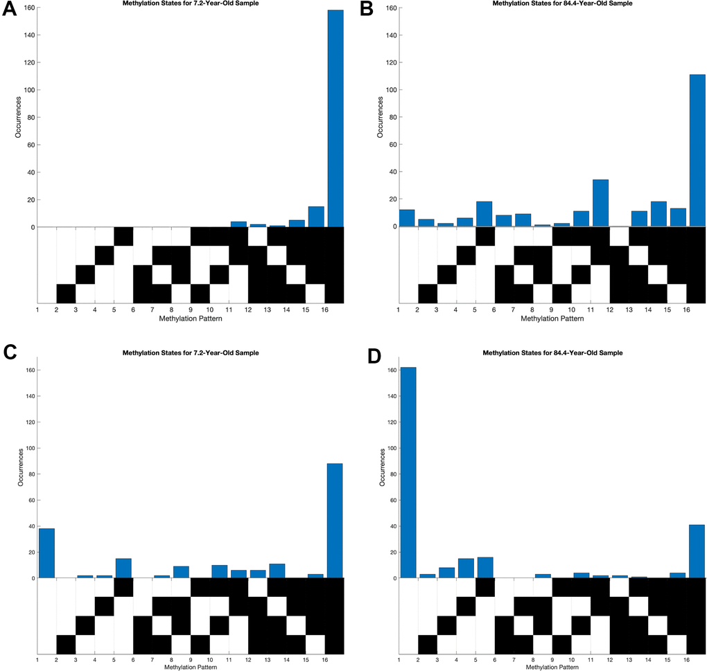 To better understand the global trends across all loci, we focused our attention on two loci that show extreme correlation of entropy and age. The locus at chr15:51681883-51681783 was of particular interest due to its high positive correlation between entropy and age as well as average methylation and age. The correlation coefficient between age and average methylation was 0.82 and that between age and entropy was 0.79 (Supplementary Figure 1A, 1B). The youngest sample of 7.2 years had mostly hypomethylated reads while the oldest sample of 84.4 years had a much broader occurrence of distinct methylation patterns (Figure 2A, 2B). Though the entirely unmethylated pattern was most prominent in both the young and old individuals, the old sample had a substantial number of reads with partial methylation. We also focused on the locus at chr2:101001739-101001859 because of its prominent negative correlation between entropy and age but high positive correlation between average methylation and age. The correlation coefficient between age and average methylation was 0.73 and that between age and entropy was -0.63 (Supplementary Figure 1C, 1D). As expected, the 7.2-year-old sample had many more occurrences of distinct methylation patterns, while the 84.4-year-old sample primarily had fully methylated patterns (Figure 2C, 2D).