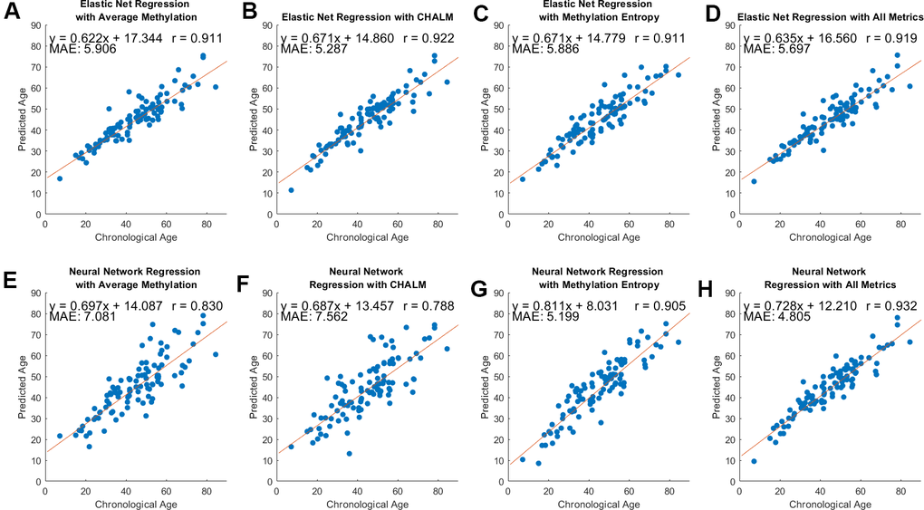 The Pearson’s correlation coefficient between the predicted and actual ages ranged from 0.79 and 0.93, and the mean average error (MAE) ranged from 4.81 to 7.56 years. Using elastic net regression yielded models that had correlation values consistently over 0.9 and MAE under 6 years for all metrics (Figure 3A–3D). The average number of loci that were contained in the training data after applying elastic net regression were 47, 55, 57, and 56 for the models using average methylation, CHALM, methylation entropy, and all metrics, respectively. By contrast, neural net regression produced models with more variability in performance. Using neural net regression, the mean-based metrics (average methylation and CHALM) had correlation coefficients below 0.9 and MAE greater than 7 years (Figure 3E, 3F). However, the neural net regression models with entropy and all three metrics had correlation coefficients above 0.9 and the lowest MAE among all models (Figure 3G, 3H). The elastic net regression models had a greater tendency than neural network models to overestimate age for young samples and underestimate age for old samples (Supplementary Figure 2). This is unsurprising given the greater flexibility and ability to capture complex relationships of neural network regression compared to elastic net regression. To compare the prediction quality of our clocks to clocks trained on known age-associated CpGs, we repeated the analysis using methylation levels of individual CpG cites from Horvath’s epigenetic clock [12]. The clock was trained on the average methylation levels at the 325 CpG sites that our data shared with Horvath. We applied elastic net regression to this data to predict sample ages. The resultant model had a correlation coefficient of 0.85 and MAE of 7.11 years (Supplementary Figure 3), meaning that its performance was comparable to our two mean methylation-based models (Figure 3A–3D). Together, these results show that with neural network regression, models that utilize methylation entropy can effectively predict chronological age based on epigenetic data. The prediction quality of these models may be similar or slightly better than models that strictly use mean-based methylation metrics. Model performance may be maximized by using a combination of methylation entropy and mean-based methylation metrics.