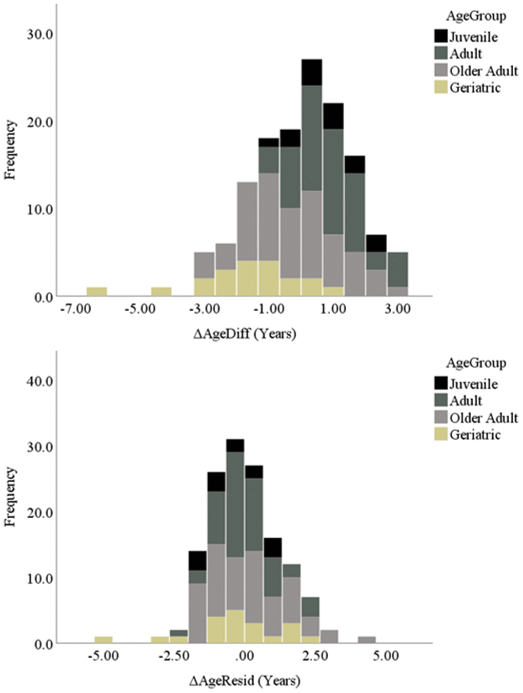 We then calculated two delta age (ΔAge) measures, representing the difference between epigenetic age and chronological age for each baboon. First, we calculated delta age representing the difference between epigenetic and chronological age for each baboon, termed ΔAgeDiff (i.e., “delta age difference”). Second, we calculated delta age as the regression residual between chronological and epigenetic age, obtained by regressing epigenetic age onto chronological age and saving the unstandardized residual, termed ΔAgeResid (i.e., “delta age residual”). Using these two variables, baboons were then categorized as showing age deceleration, acceleration, or a relative match according to the parameters described in detail in the Methods. These two measures yielded slightly different categorizations of age-accelerated and -decelerated baboons (Table 1). Additionally, as shown in Figure 2, the two measures showed slightly different categorizations across age group (juvenile, young adult, older adult, and geriatric [65]). According to these categorizations of age acceleration and deceleration, approximately 19% (using ΔAgeResid) to 27% (using ΔAgeDiff) of our sample exhibited age acceleration (i.e., epigenetic age one or more years greater than chronological age, approximately equivalent to greater than 3 years of age acceleration in humans [62, 66]). Another approximately 21% (ΔAgeResid) to 28% (ΔAgeDiff) of the sample showed age deceleration, and approximately 45% (ΔAgeDiff) to 58% (ΔAgeResid) showed a relative match between their epigenetic and chronological ages.