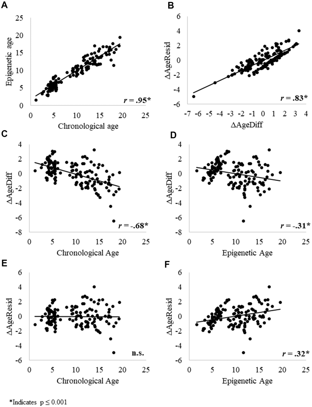 We then examined relationships between the epigenetic, chronological, and delta age variables. Consistent with previous research, chronological age significantly predicted epigenetic age (Figure 3A). ΔAgeResid and ΔAgeDiff were significantly, positively correlated (Figure 3B), indicating that these two variables measure correlated aspects of aging. ΔAgeDiff was significantly negatively correlated with both chronological and epigenetic age (Figure 3C and 3D), whereas ΔAgeResid was not correlated with chronological age (Figure 3E) but was significantly positively correlated with epigenetic age (Figure 3F). At face value, the negative correlations between ΔAgeDiff and chronological and epigenetic age seem to indicate that the epigenetic clock tends to underestimate age for older individuals.