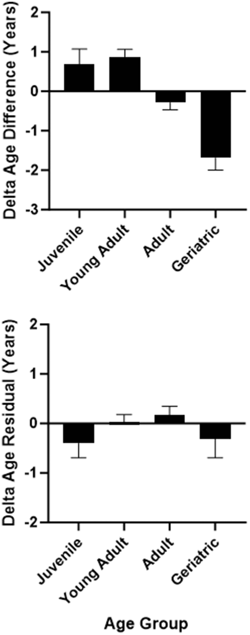 To characterize age acceleration and deceleration across our sample, we used univariate ANOVAs to explore differences in ΔAgeDiff and ΔAgeResid as a function of sex, rearing, and age group (as described above: juvenile, adult, older adult, geriatric). Due to the low number of males in the sample, as well as the high number of nursery-reared females in the older age categories, we could not assess interaction effects. As such, only main effects are reported. We performed these analyses with both delta age variables.