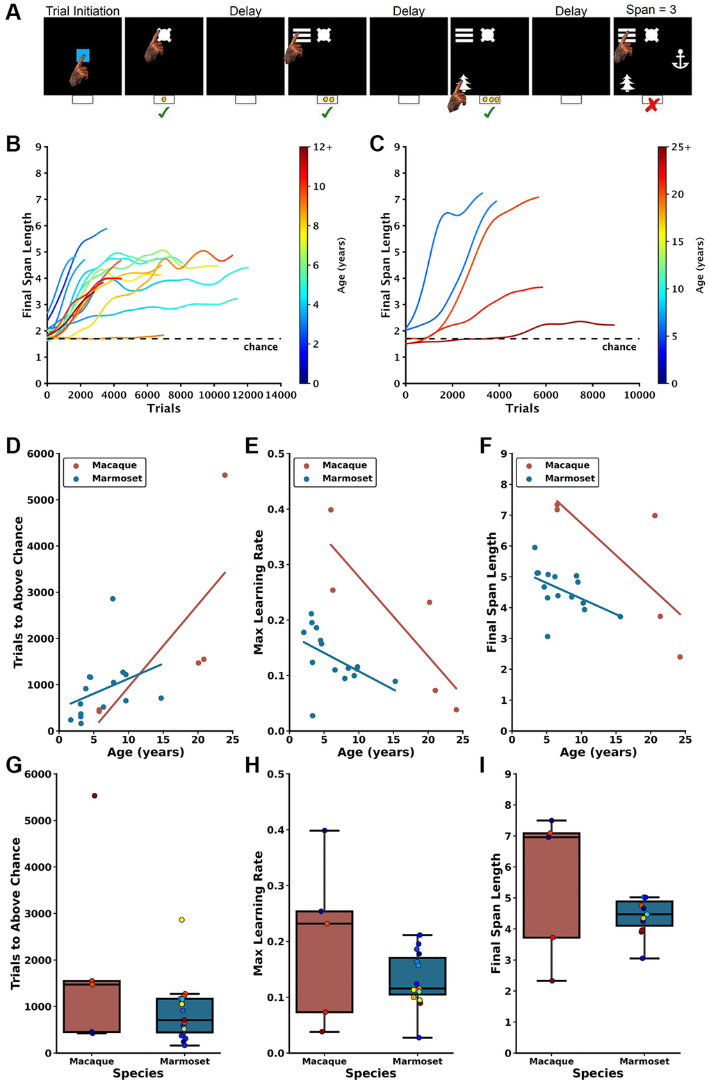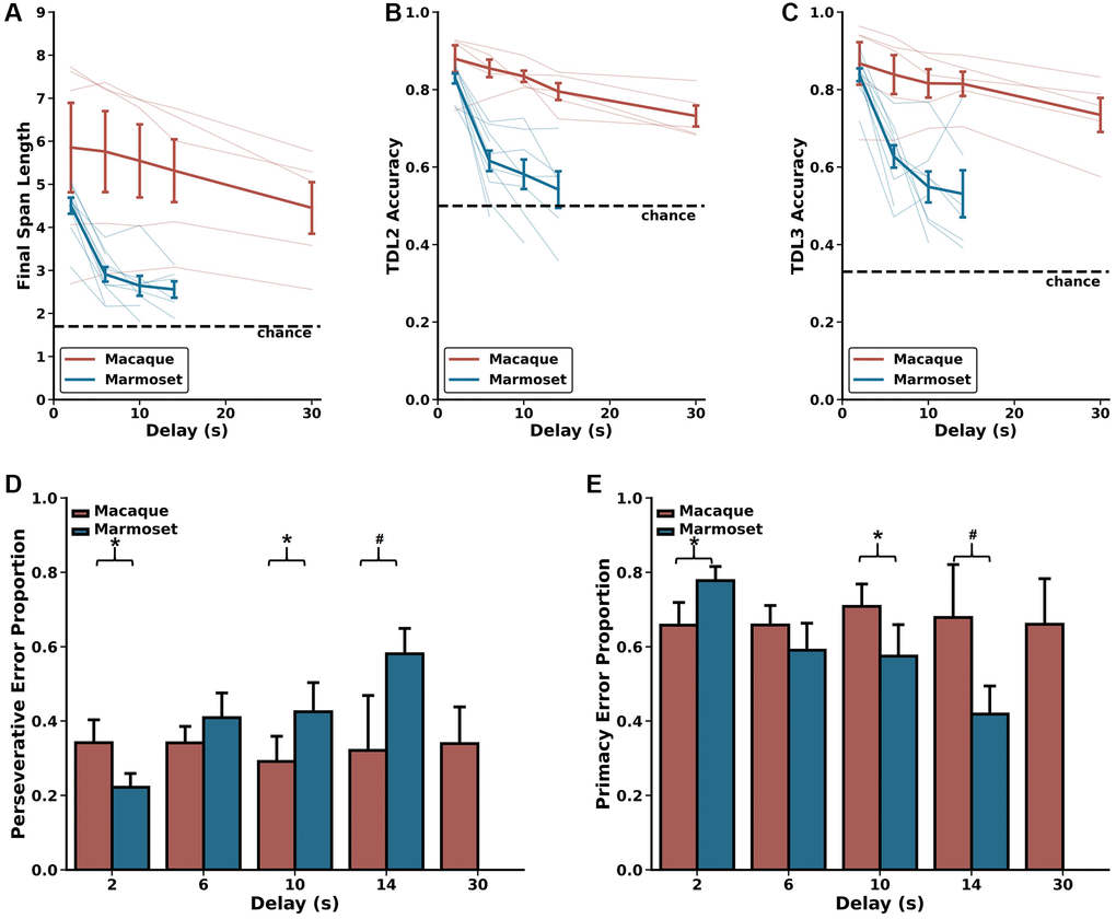 The Delayed Recognition Span Task (DRST) measures working memory capacity (Figure 1A). Each trial of the DRST was initiated when a monkey touched a blue square in the center of the screen. Subsequently, a single black and white stimulus, chosen at random from a pool of 400 images, appeared on the screen in one of nine possible locations, also determined randomly (see Figure 1A for example stimuli). Upon touching this initial stimulus, the monkey received a small reward. After a delay, during which the screen remained blank, a two-alternative forced choice was presented. This choice included the original stimulus in its original location and a novel, visually distinct stimulus placed in a different pseudo-randomly selected location. If the monkey selected the novel stimulus, a correct response was recorded, a reward was dispensed, and another delay ensued. Subsequently, the first two stimuli reappeared in their original positions, and a third novel stimulus was introduced in a pseudo-randomly chosen location, with reward dispensed for selection of this new stimulus. This process continued with the introduction of novel stimuli after additional delays until the trial reached one of three possible conclusions: (1) the monkey successfully made nine consecutive correct selections; (2) the monkey failed to make a selection within a 12-second timeframe (i.e., omission); (3) the monkey made an incorrect response by selecting a non-novel stimulus. In cases of omission or incorrect responses, no reward was provided, and a five-second time-out period commenced before a new trial could be initiated. The “Final Span Length” for each trial was recorded as the number of correctly selected stimuli before the trial’s conclusion. The variations in the number of stimuli on the screen as trials progressed were referred to as trial difficulty levels (TDLs). Macaques and marmosets performed the DRST with a 2 second delay until performance levels plateaued. Subsequently, all macaques and a subset of the marmosets were tested on the DRST with delays greater than two seconds. Macaques and marmosets were tested with delays of 2, 6, 10, and 14 seconds, and macaques were additionally tested with a 30 second delay.