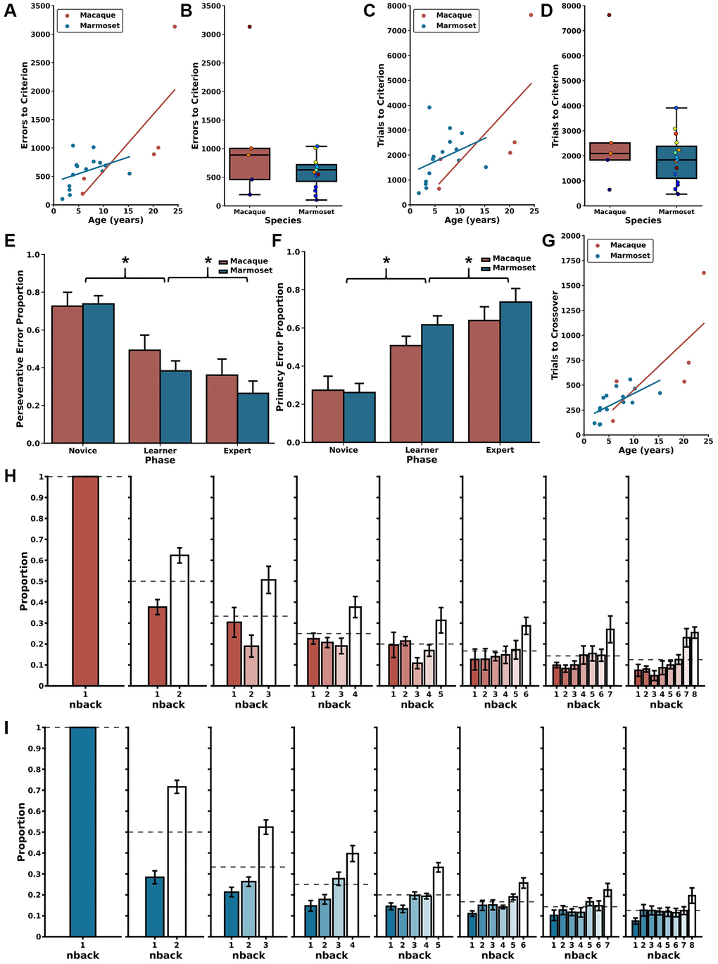 We capitalized on the fact that within the context of each DRST trial there existed an opportunity to directly compare performance between macaques and marmosets on the more commonly-used DNMS paradigm. We found that, in both species, aging was associated with impaired performance, measured by errors to a learning criterion. This aligns with numerous studies in macaques reporting similar findings [15, 56–59].
