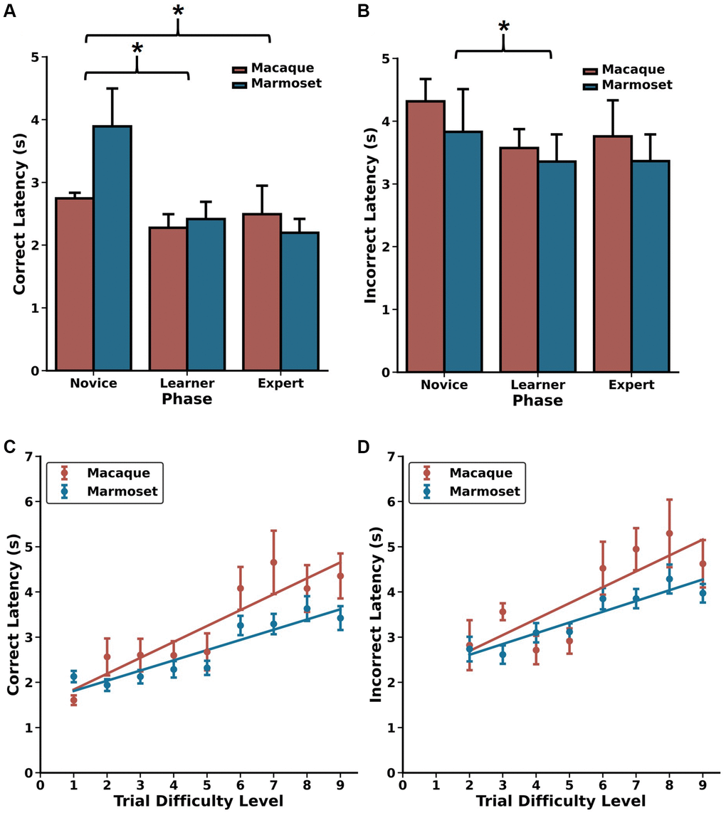We next examined whether elevated cognitive load was reflected in the choice latency data from the Expert Phase. To do this, we analyzed correct and incorrect choice latency data separately for each of the TDLs. We found strong, positive associations between increasing TDL and increasing correct latency for both macaques and marmosets (Figure 3C, 3D; Spearman’s rank-order correlations; Macaque: r(7) = 0.900, p = 9.431 × 10−4; Marmoset: r(6) = 0.933, p = 2.359 × 10−4). Similar associations were also found between TDL and incorrect latency (Spearman’s rank-order correlations; Macaque: r(6) = 0.810, p = 1.490 × 10−2; Marmoset: r(6) = 0.952, p = 2.604 × 10−4). Together, these results demonstrate that, as TDLs increase, so does cognitive load, and this is reflected in increased processing time and longer choice latencies in both macaques and marmosets.