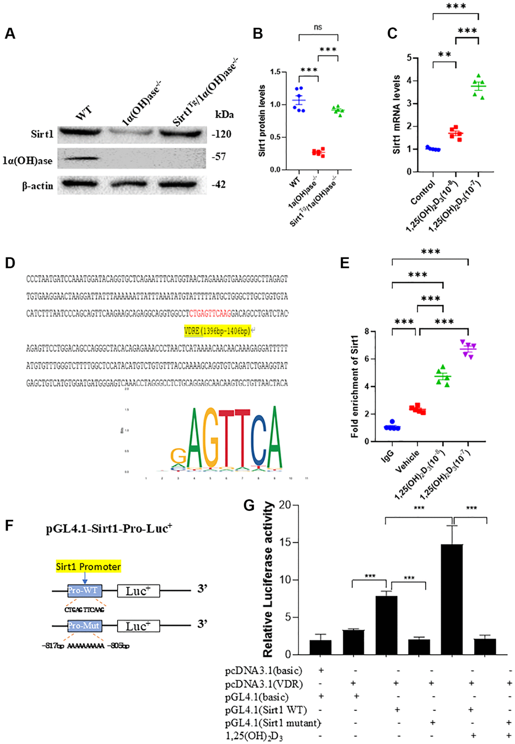 To test this hypothesis, we conducted experiments using wild-type, 1α-hydroxylase knockout (1α(OH)ase−/−), and Sirt1 transgenic (Sirt1Tg) 1α(OH)ase−/− mice. We examined Sirt1 expression levels in muscle tissues and investigated the regulation of Sirt1 by 1,25(OH)2D in myoblasts through VDR-mediated gene transcription. Additionally, we evaluated the effects of Sirt1 overexpression in MSCs on muscle mass, fiber type, senescence markers, and muscle regeneration in the context of 1,25(OH)2D deficiency-induced sarcopenia.