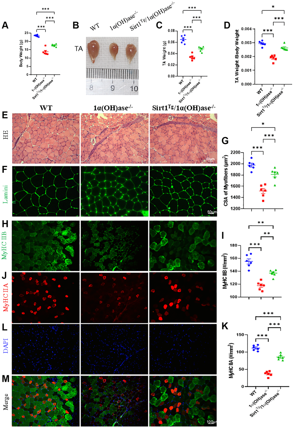 To determine whether Sirt1 overexpression in MSCs could correct skeletal muscle mass reduction caused by 1,25(OH)2D deficiency, we measured body weight, tibialis anterior muscle weight, and tibialis anterior muscle weight relative to body weight in 2-month-old male wild-type, 1α(OH)ase−/− and Sirt1Tg1α(OH)ase−/− littermates. Statistical analysis showed that body weight, tibialis anterior muscle weight, and tibialis anterior muscle weight/body weight ratio were significantly lower in 1α(OH)ase−/− mice compared to wild-type mice. In contrast, they were significantly higher in Sirt1Tg1α(OH)ase−/− mice compared to 1α(OH)ase−/− mice (Figure 2A–2D). These results demonstrate that 1,25(OH)2D deficiency can lead to skeletal muscle mass reduction, while Sirt1 overexpression in MSCs can significantly improve skeletal muscle mass reduction caused by 1,25(OH)2D deficiency.