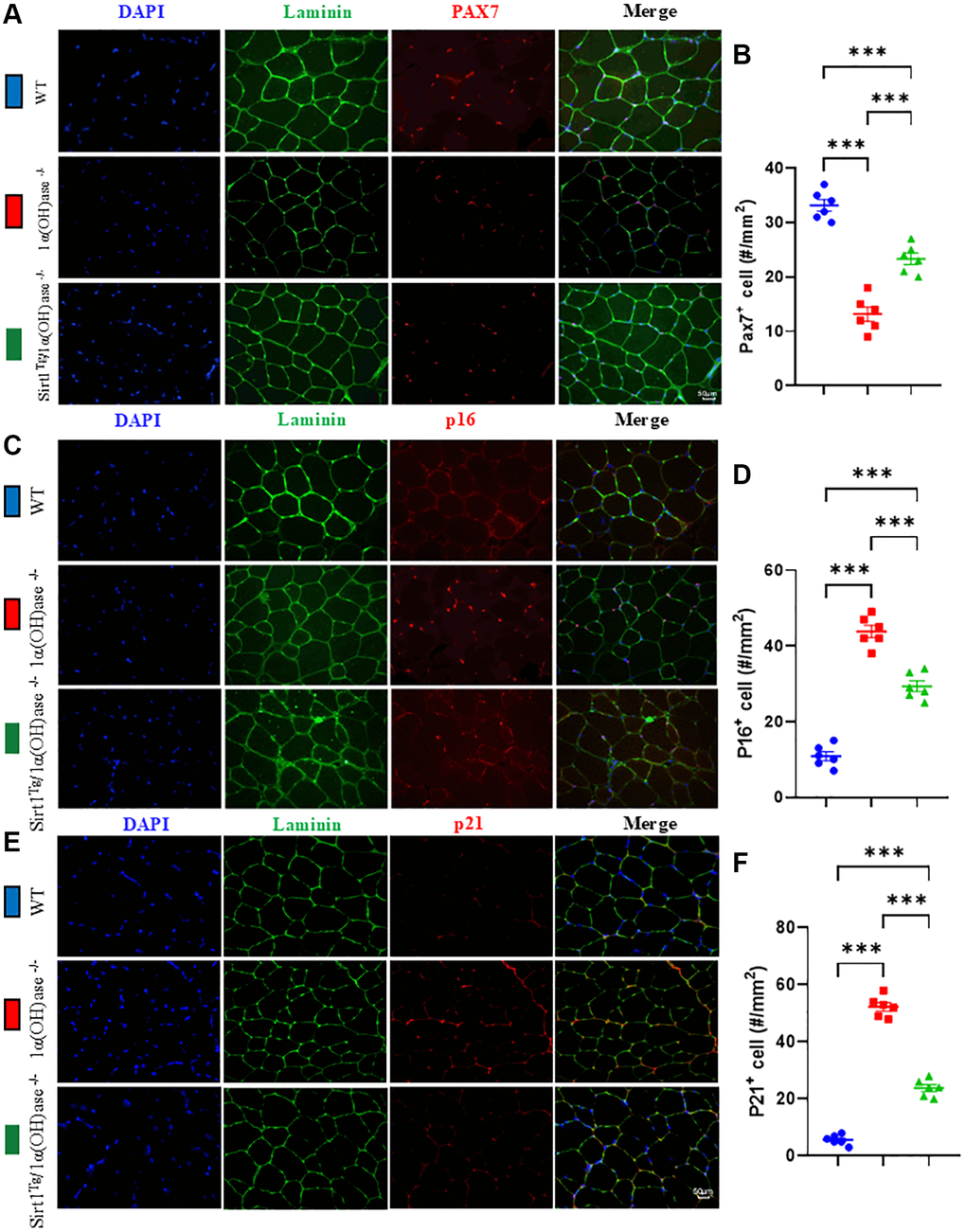 To determine whether the correction of 1,25(OH)2D deficiency-induced sarcopenia by Sirt1 overexpression in MSCs is related to inhibition of skeletal muscle cell senescence caused by 1,25(OH)2D deficiency, we collected tibialis anterior muscle from 2-month-old wild-type, 1α(OH)ase−/− and Sirt1Tg1α(OH)ase−/− mice and performed p16 and p21 immunofluorescence staining on cryosections to compare changes in skeletal muscle cell senescence between genotypes. The results showed that the percentage of p16 and p21 positive cells was significantly increased in 1α(OH)ase−/− mice compared to wild-type mice. In contrast, these markers were significantly decreased in Sirt1Tg1α(OH)ase−/− mice compared to 1α(OH)ase−/− mice (Figure 3C–3F). These results indicate that Sirt1 overexpression in MSCs may correct 1,25(OH)2D deficiency-induced sarcopenia by inhibiting skeletal muscle cell senescence.