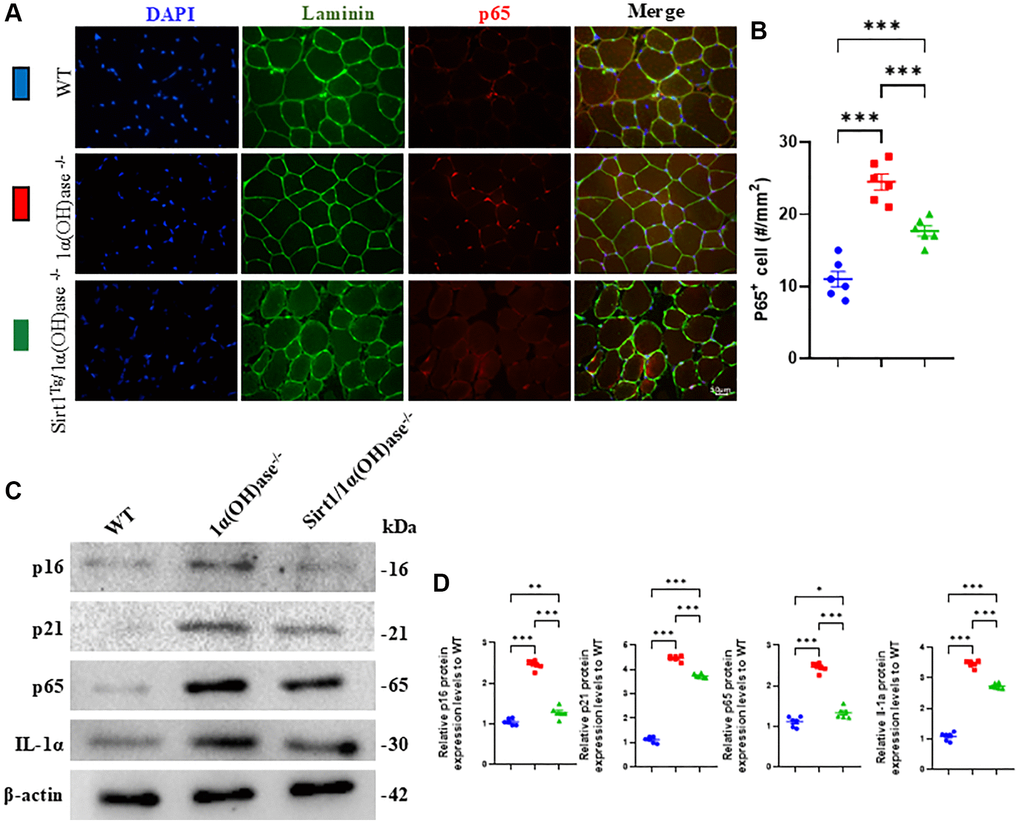To determine whether the correction of 1,25(OH)2D deficiency-induced sarcopenia by Sirt1 overexpression in MSCs is related to inhibition of increased skeletal muscle SASP caused by 1,25(OH)2D deficiency, we collected tibialis anterior muscle from 2-month-old mice of the three genotypes and used p65 immunofluorescence staining and Western blots to compare changes in skeletal muscle cell senescence and SASP-related markers between genotypes. The results showed that the percentage of p65 positive cells and the protein expression levels of p16, p21, p65 and IL-1α were significantly increased in 1α(OH)ase−/− mice compared to wild-type mice. In contrast, these markers were significantly decreased in Sirt1Tg1α(OH)ase−/− mice compared to 1α(OH)ase−/− mice (Figure 4A–4D). These results indicate that Sirt1 overexpression in MSCs may correct 1,25(OH)2D deficiency-induced sarcopenia by inhibiting skeletal muscle SASP.
