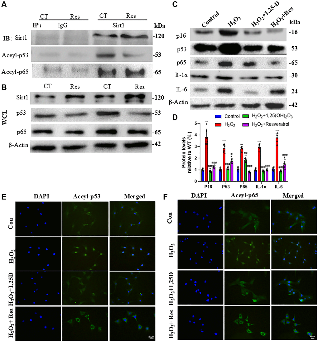 1,25(OH)2D3 or resveratrol inhibits C2C12 cell senescence and SASP by activating Sirt1 to decrease acetylated p53 and p65 levels and activities