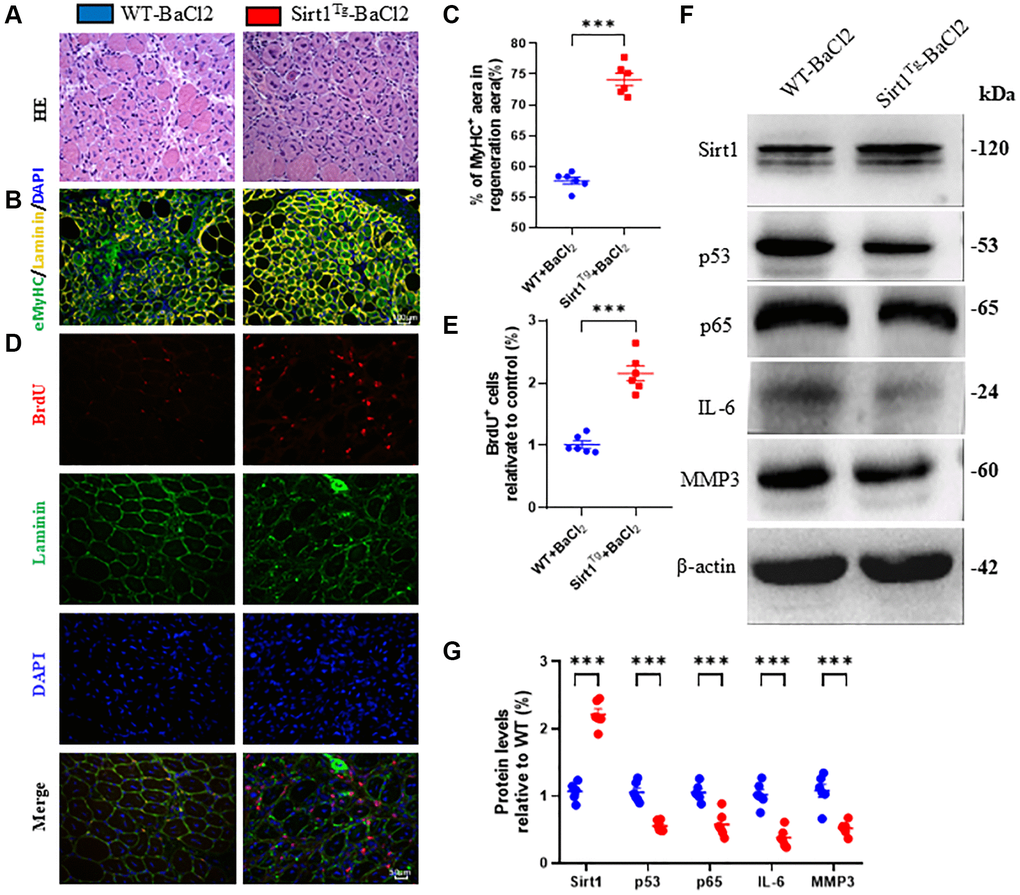 To determine if Sirt1 overexpression in MSCs can promote skeletal muscle regeneration and accelerate injury repair, we injured the right tibialis anterior muscle of 2-month-old wild-type and Sirt1Tg mice with BaCl2. After 5 days, injured muscles were collected for cryosection and immunofluorescence staining of BrdU injected intraperitoneally 48 hrs before tissue collection. H&E staining, eMyHC, and BrdU immunofluorescence staining were used to analyze muscle injury repair. Western blots were performed on tissue lysates. Compared to WT+BaCl2, the number of newborn muscle fibers, eMyHC positive fiber area, and percentage of BrdU positive cells were significantly increased at 5 days after injury in Sirt1Tg+BaCl2 mice (Figure 6A–6E). Western blots of injured muscle lysates showed Sirt1 protein expression was significantly increased, while p53, p65, IL-6 and Mmp3 levels were decreased in Sirt1Tg+BaCl2 compared to WT+BaCl2 mice (Figure 6F, 6G). These results indicate that Sirt1 overexpression in MSCs can accelerate skeletal muscle injury repair by promoting regeneration.