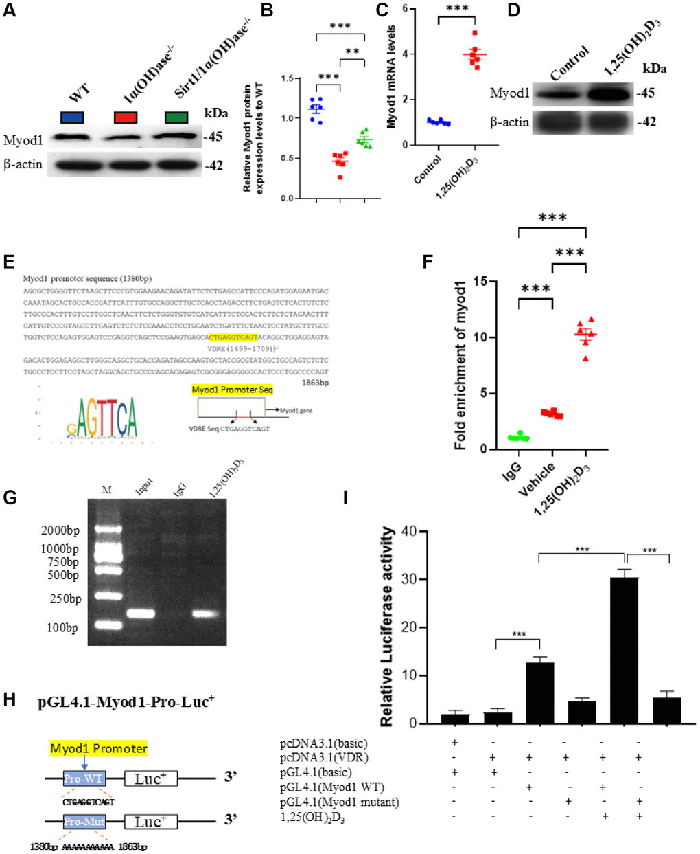 Given that MyoD1 plays a very important role in promoting myoblast differentiation, myoblast fusion and myotube formation as well as in the regulation of muscle-specific gene expression during muscle regeneration in response to injury and atrophy, we utilized Western blotting to detect the levels of MyoD1 protein expression in tibialis anterior muscles of 2-month-old male wild-type, 1α(OH)ase−/− and Sirt1Tg1α(OH)ase−/− littermates. The results showed that MyoD1 protein expression was significantly downregulated in skeletal muscles of 1α(OH)ase−/− mice, while it was markedly upregulated in skeletal muscles of 1α(OH)ase−/− mice with MSC-overexpressing Sirt1 (Figure 7A, 7B). Previous studies showed that active vitamin D can upregulate MyoD1 expression in skeletal muscle, however the underlying mechanism has been unclear. We treated C2C12 cells with 10−8 M 1,25(OH)2D3 and detected Myod1 mRNA and protein levels using real-time RT-PCR and Western blot. The results showed that 1,25(OH)2D3 treatment significantly increased Myod1 mRNA and protein expression in C2C12 cells (Figure 7C, 7D). To investigate whether 1,25(OH)2D3 transcriptionally regulates Myod1 expression through VDR, we performed bioinformatic analysis and identified a VDRE-like sequence in the Myod1 gene promoter region (Figure 7E). We then utilized ChIP assay to examine whether VDR could bind to the VDRE in the Myod1 promoter. PCR detection of the ChIP products showed that the Myod1 promoter VDRE sequence was present in the total input sample, and its enrichment by VDR antibody immunoprecipitation was greater than that by IgG immunoprecipitation (Figure 7F, 7G). These results demonstrated that VDR could physically bind to the VDRE-like sequence in the Myod1 promoter region. To further confirm that 1,25(OH)2D3 transcriptionally regulates Myod1 expression through VDR, we constructed luciferase reporter plasmids containing the Myod1 promoter region and a VDR overexpression plasmid (Figure 7H). After transfection into C2C12 cells and 1,25(OH)2D3 treatment for 24 h, luciferase reporter assays were performed at 48 h. The results showed that compared to empty vector, luciferase activity significantly increased in C2C12 cells transfected with pGL4.1-Myod1 (WT) plasmid, and was further enhanced by 1,25(OH)2D3 treatment. However, luciferase activity did not increase in C2C12 cells transfected with a pGL4.1-Myod1 (mutant) plasmid, nor was the mutant reporter activated by 1,25(OH)2D3 treatment (Figure 7I). These results demonstrate that 1,25(OH)2D3 can upregulate Myod1 expression in C2C12 cells by VDR-mediated transcriptional regulation.