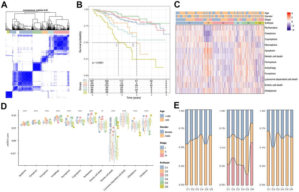The association between the expression of PCD-related genes in the MMRF-COMPASS training set cohort patients was analyzed. Here, a total of 434 genes significantly related to the prognosis of MM were filtered (p<0,001). Subsequently, according to the expression profiles of the 434 genes, 592 patients in MMRF-COMPASS training cohort were classified by consensus clustering method. From the results of the cumulative distribution function (CDF) Delta area, the CDF downward slope was the smallest at k = 6, which had a more stable clustering result (Supplementary Figure 1). Therefore, the whole cohort was divided into six molecular subtypes (C1, C2, C3, C4, C5, C6) (Figure 1A) with significant prognostic differences (Figure 1B). Overall, MM patients in the C5 subtype had a better prognosis, in contrast, those in the C6 subtype had a lower survival rate. Figure 1C shows the distinct clinical features of MM patients in the six subtypes, and it can be observed that most patients in the C1, C3, and C6 subtypes did not differ significantly in terms of their staging, grading, and age. Meanwhile, the results of differential analysis demonstrated significant differences between different PCD scores across the six molecular subtypes (Figure 1D). Subsequently, analysis on the clinicopathological features between different subtypes in the MMRF-COMPASS training cohort showed a higher grade of the C6 subtype (Figure 1E). Overall, MM prognosis and the expression of PCD-related genes were remarkably different among the six molecular subtypes.