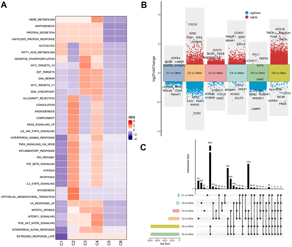 (Figure 3A). In addition, we further identified DEGs by comparing each subtype against other subtypes (e.g., C1 vs. all others, C2 vs. all others, etc.) using the ‘limma’ package under the criteria of FDR < 0.05 and |log2FC| > log2(1.5) (Figure 3B). Moreover, analysis on the distribution of DEGs across these molecular subtypes showed that only eight genes were consistently differentially expressed in all the subtype comparisons (C1 vs. others, C2 vs. others, C3 vs. others, C4 vs. others, C5 vs. others, and C6 vs. others) (Figure 3C). Collectively, these findings indicated that different subtypes of MM were characterized by specific genomic and molecular features, which were closely correlated with MM prognosis.