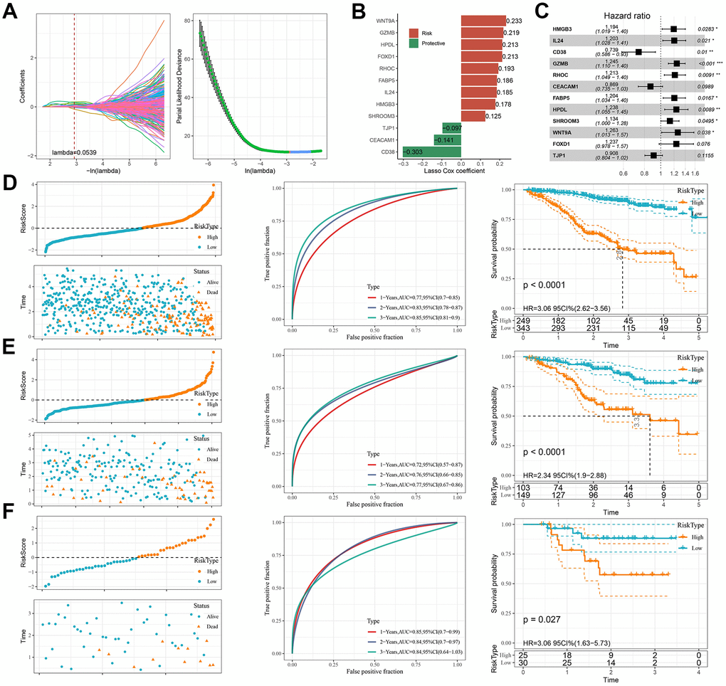 Each patient in the TCGA cohort was assigned with a Risk score calculated by the formula: Risk score=0.178*HMGB3+0.185*IL24-0.303*CD38+0.219*GZMB+0.193*RHOC-0.141*CEACAM1+0.186* FABP5+ 0.213*HPDL+ 0.125*SHROOM3+ 0.233*WNT9A+ 0.213*FOXD1-0.097*TJP1.