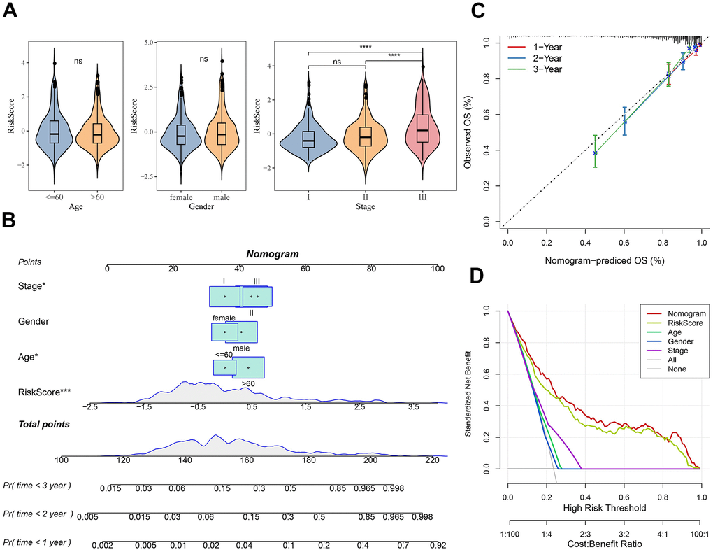 Subsequently, differences in clinicopathological features between the risk subgroups in the MMRF-COMPASS training set were compared. It was found that gender and age did not differ significantly between the two risk groups, whereas the Risk score increased as the clinical grade advanced (Figure 5A). We further performed multivariate Cox regression analysis combining stage, age, gender, and the Risk score to establish a nomogram to better evaluate OS for MM patients. As shown in Figure 5B, the Risk score showed the greatest impact on the OS prediction in MM, followed by age and stage. Further, the calibration curves demonstrated that the 1-, 2-, and 3-year prediction calibration curves were close to the standard ones, suggesting that the model had a high prediction accuracy (Figure 5C). Interestingly, the accuracy of our risk model further assessed by the decision curve analysis (DCA) also performed well in assessing MM prognosis. (Figure 5D).